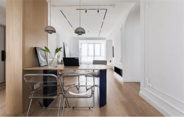 餐厅规划于玄关墙后,让用餐更具私密感。以玄关墙为中心,形成环绕动线,人在空间中可以自由穿梭。