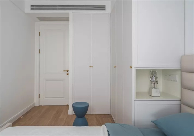 次卧L形通顶柜,增加储物功能的同时不会造成空间逼仄。靠近床头设计开放格,并在其中预留插座盒开关,代替床头柜,节省空间。