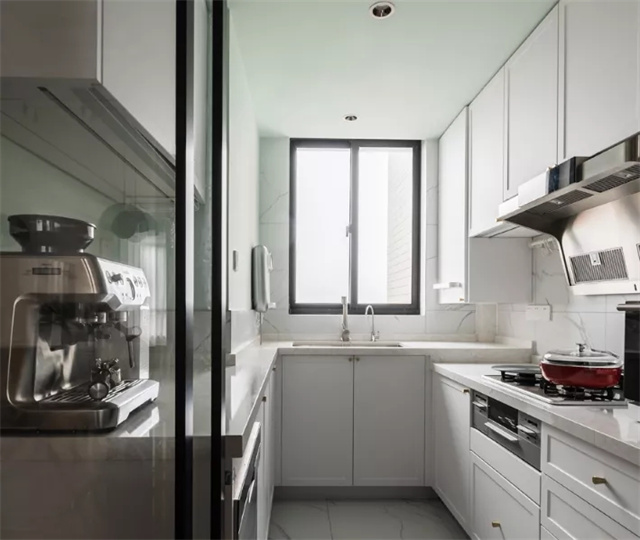厨房借用部分次卧空间,打造成动线合理的U字形厨房,烹饪更加自在方便。