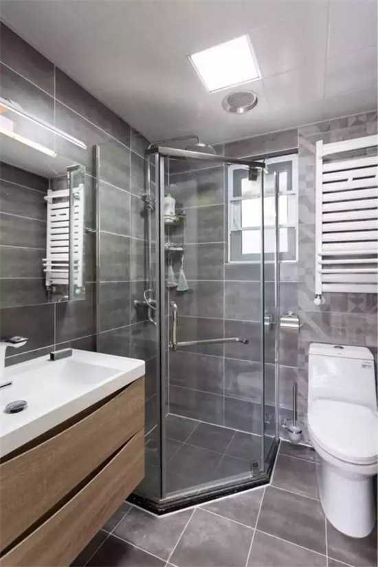 或者是做一个玻璃的门来划分淋浴区,好处就是平时可以收到淋浴区内,让卫生间变得更加宽敞,玻璃隔断也能让光线流通起来,卫生间自然就更明亮了。