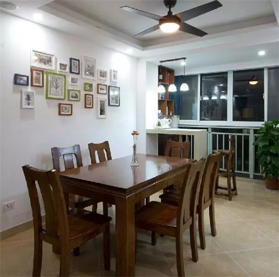 ▲餐厅简简单单的设计,墙壁上的照片墙是厨房的主要装饰,而且电扇灯有种复古风,深木色的餐桌椅我觉得有点深沉,过些日子再弄一张好看的餐桌布,肯定不会这么死沉了。
